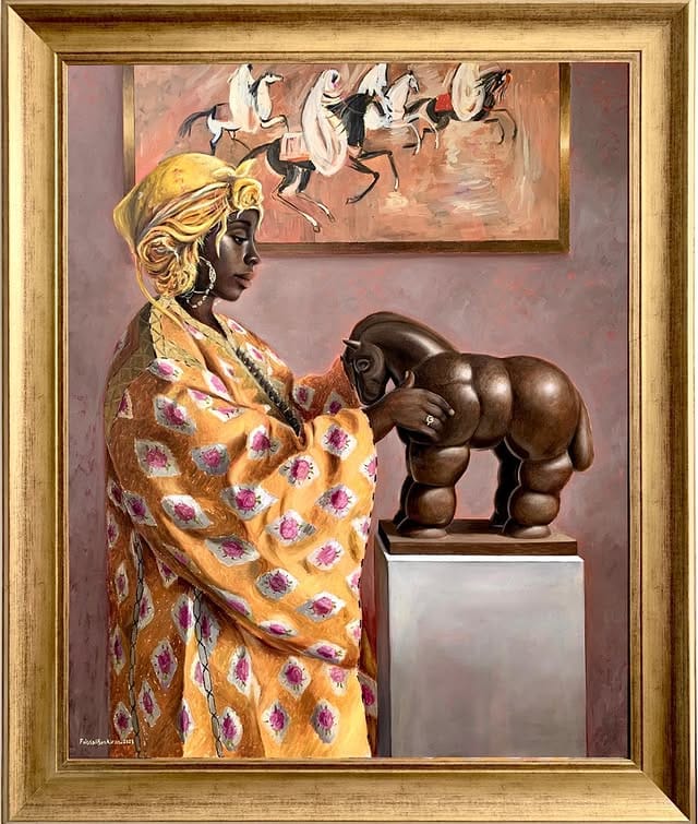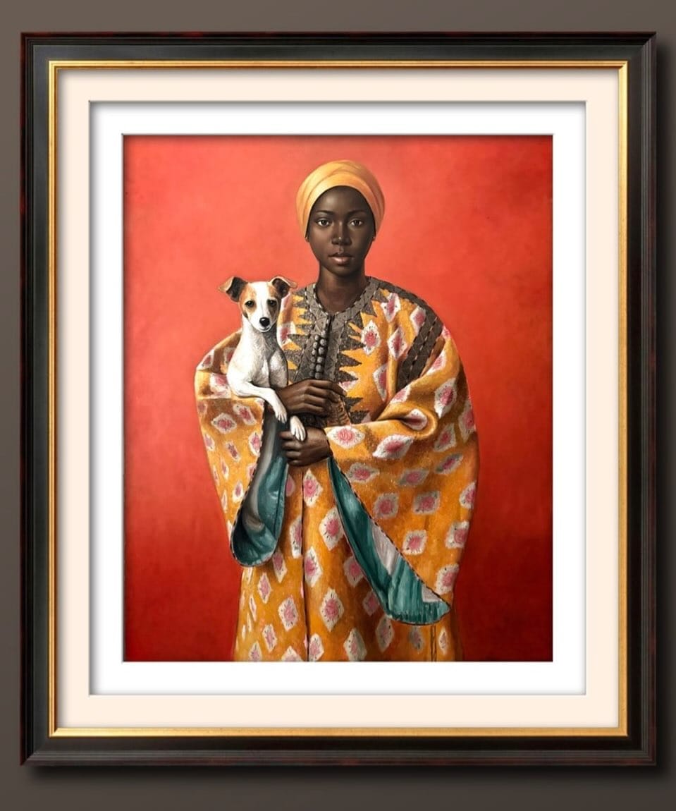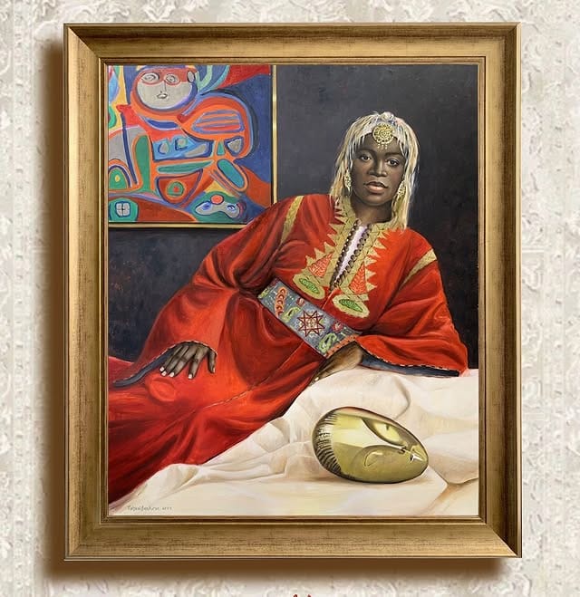 Ben Kiran reclaims their image with tenderness and precision. In his paintings, these women are no longer anonymous or marginal. They appear composed, proud, and central. He gives them names: Anbar, Marjana, Yaqouta, Batoul and robes made of brocade, silk, or lekhrib, traditional textiles rich in symbolism. He surrounds them with objects of meaning: finely crafted lamps, ceramic vessels, antique clocks, and embroidered cushions, each loaded with historical and cultural resonance. These portraits aren’t just figurative; they are ritualized moments of acknowledgment and respect.